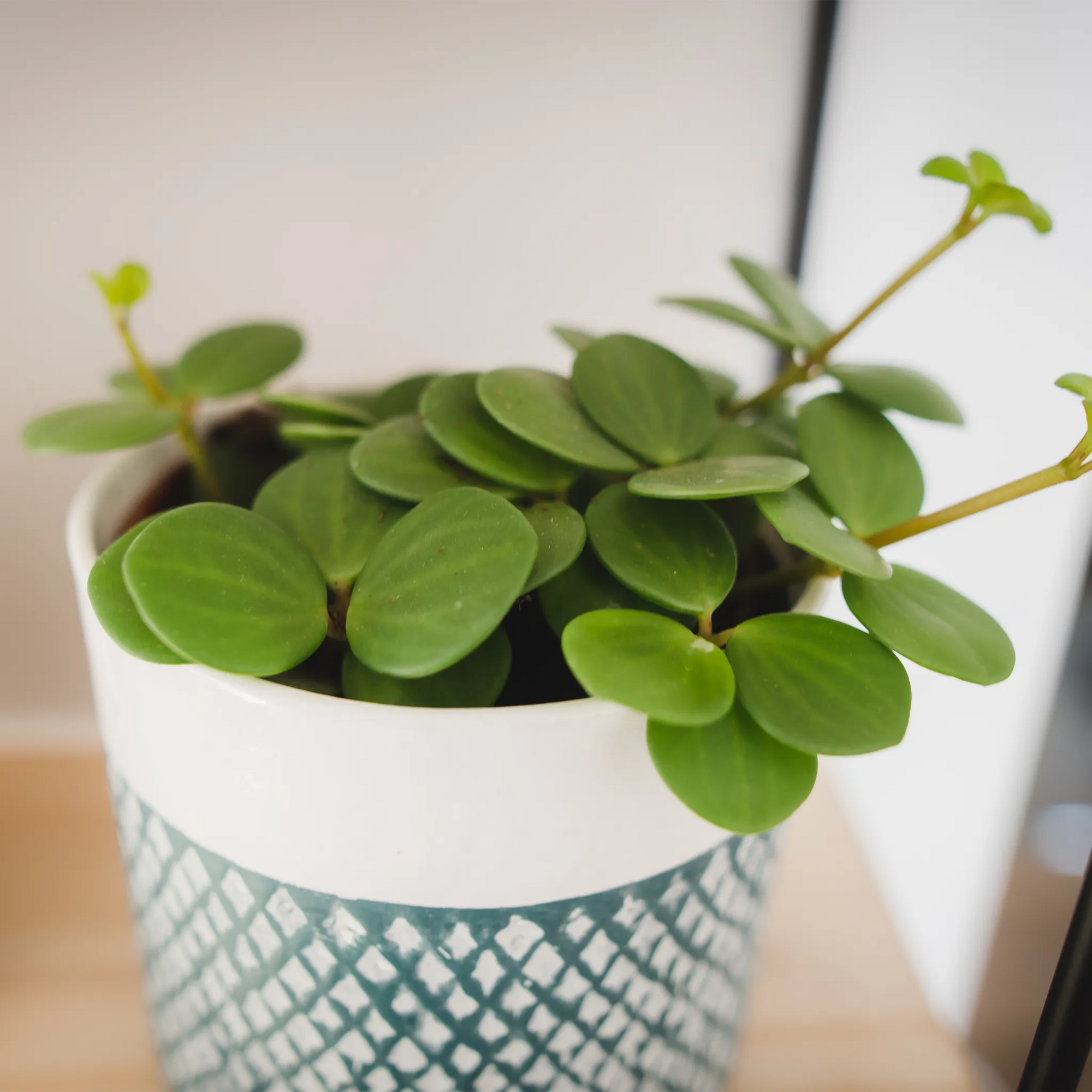 Peperomia ‘Hope’ is een hybride tussen Peperomia deppeana en Peperomia quadrifolia, die de beste eigenschappen van beide ouders combineert in een compacte en charmante plant. De ronde, vetachtige bladeren groeien in paren langs zachte, hangende stengels en zorgen voor een fris en speels uiterlijk. In tegenstelling tot veeleisendere bladplanten is ‘Hope’ vergevingsgezind en gedijt hij ook bij minimale verzorging—met slechts matig water en bescherming tegen direct zonlicht. Door zijn hangende groeiwijze is hij ideaal voor planken, bureaus of hangpotten waar de stengels sierlijk naar beneden kunnen hangen. Diervriendelijk en gemakkelijk te stekken is het een veelzijdige keuze voor plantenliefhebbers die iets onderhoudsarm maar karaktervol zoeken.